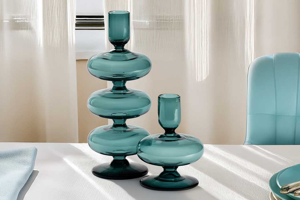 A subtle 1970s influence is expressed through its organic shape and flowing profile. Crafted from borosilicate glass, each piece is spun and mouth-blown, creating fluid lines with gentle variations that highlight its handmade character. Finished in a rich teal tone, the glass adds depth and colour, enhancing the sculptural quality of the form.