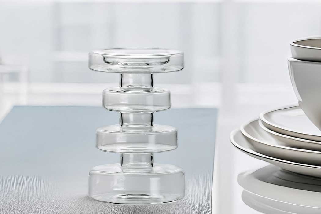 Crafted from clear borosilicate glass, each piece is spun and mouth-blown, resulting in clean, precise lines softened by subtle variations that reflect its handmade nature. The transparent glass enhances the graphic quality of the form, allowing light to move through the structure and emphasise its sculptural layers.