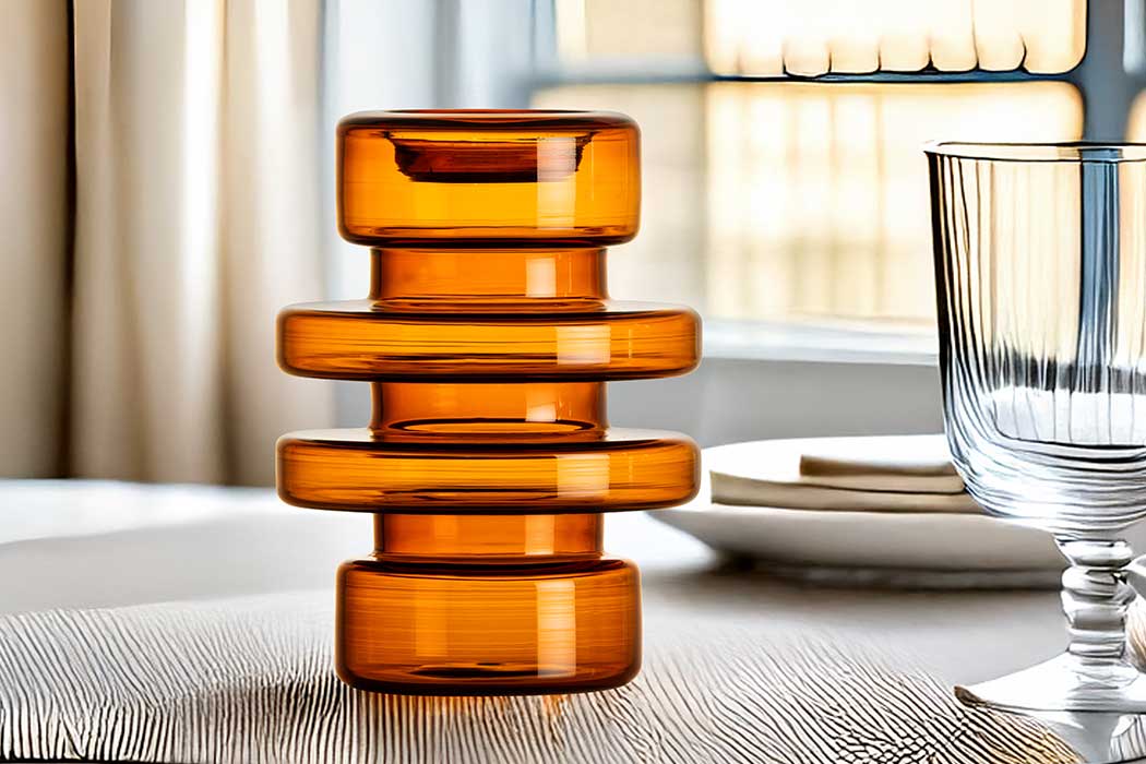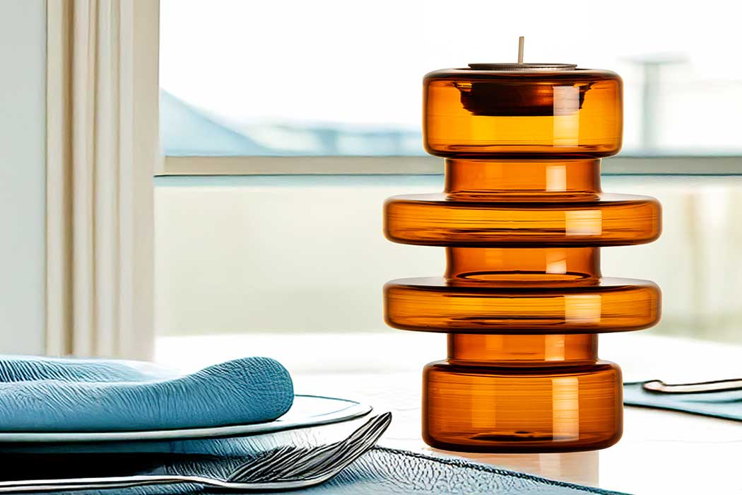 Crafted from borosilicate glass, each piece is spun and mouth-blown, resulting in clean, precise lines softened by subtle variations that reflect its handmade character. Made in rich amber glass, the tea light holder adds warmth and depth, enhancing the layered structure of the design while allowing candlelight to glow softly through the form.