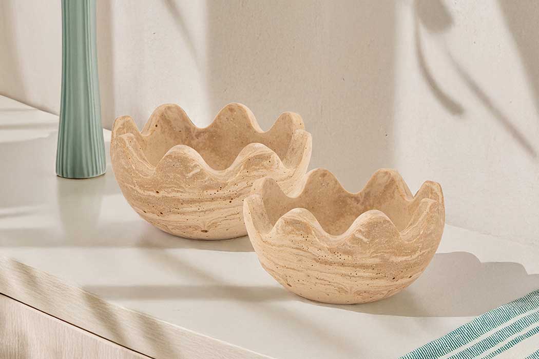 The Bloom Bowl Small brings a softer, organic note to contemporary interiors, combining natural material character with a refined, minimalist aesthetic. Cast from 65% travertine with a binder, each piece features a creamy travertine tone with irregular darker striations, creating gentle variation and depth across the surface.